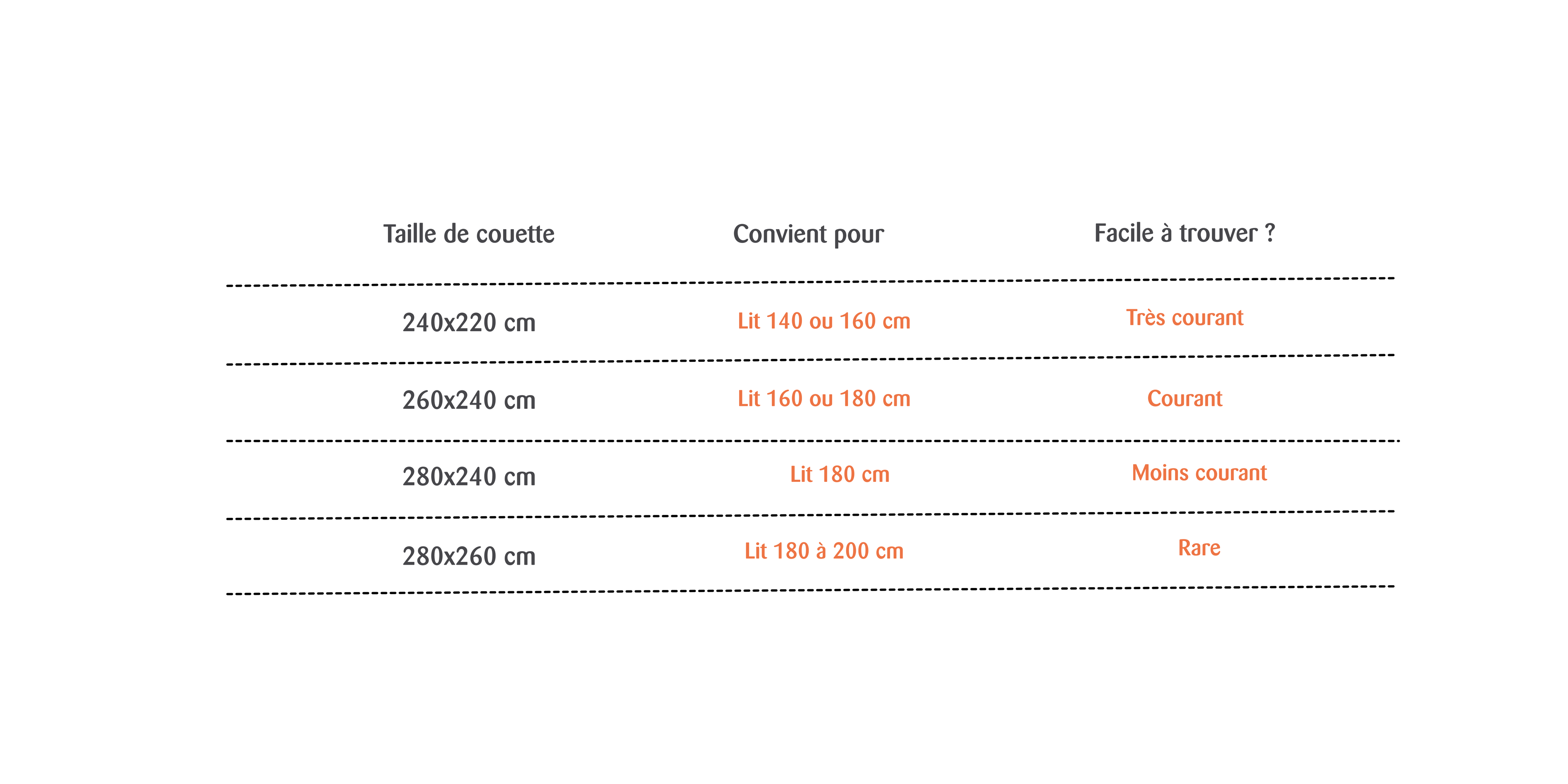 Pour ceux qui recherchent une grande couette sans les inconvénients de la 280x260, voici les formats grands standards disponibles plus facilement sur le marché de la literie :