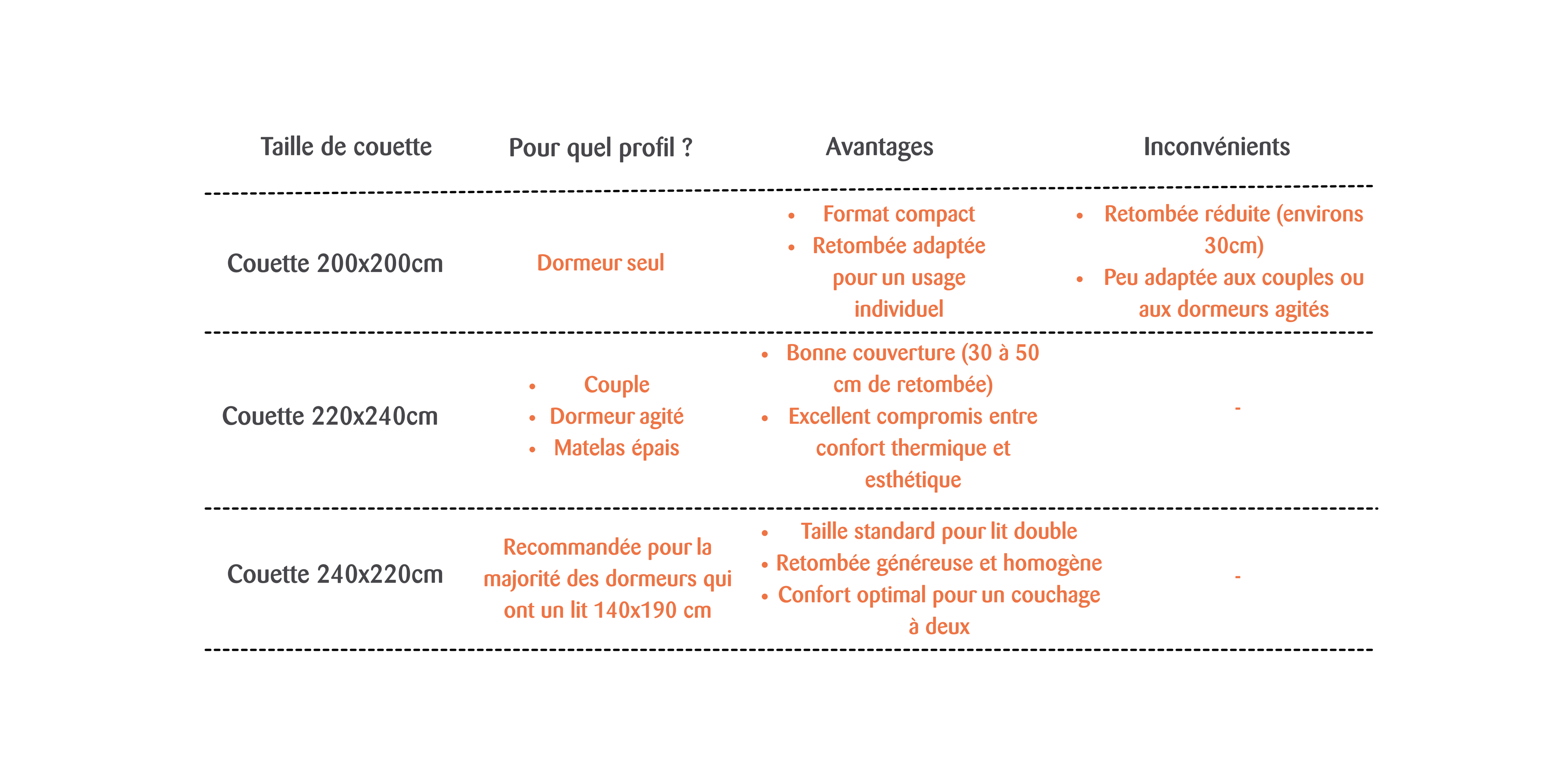 Chez Petit Meunier, spécialiste français du sommeil, la couette 240x220 cm est la taille standard proposée pour les lits doubles, dont les modèles 140x190 cm. Cette taille permet une retombée généreuse de 40 à 50 cm de chaque côté du lit, évitant les courants d’air et assurant un meilleur confort thermique pour deux dormeurs.