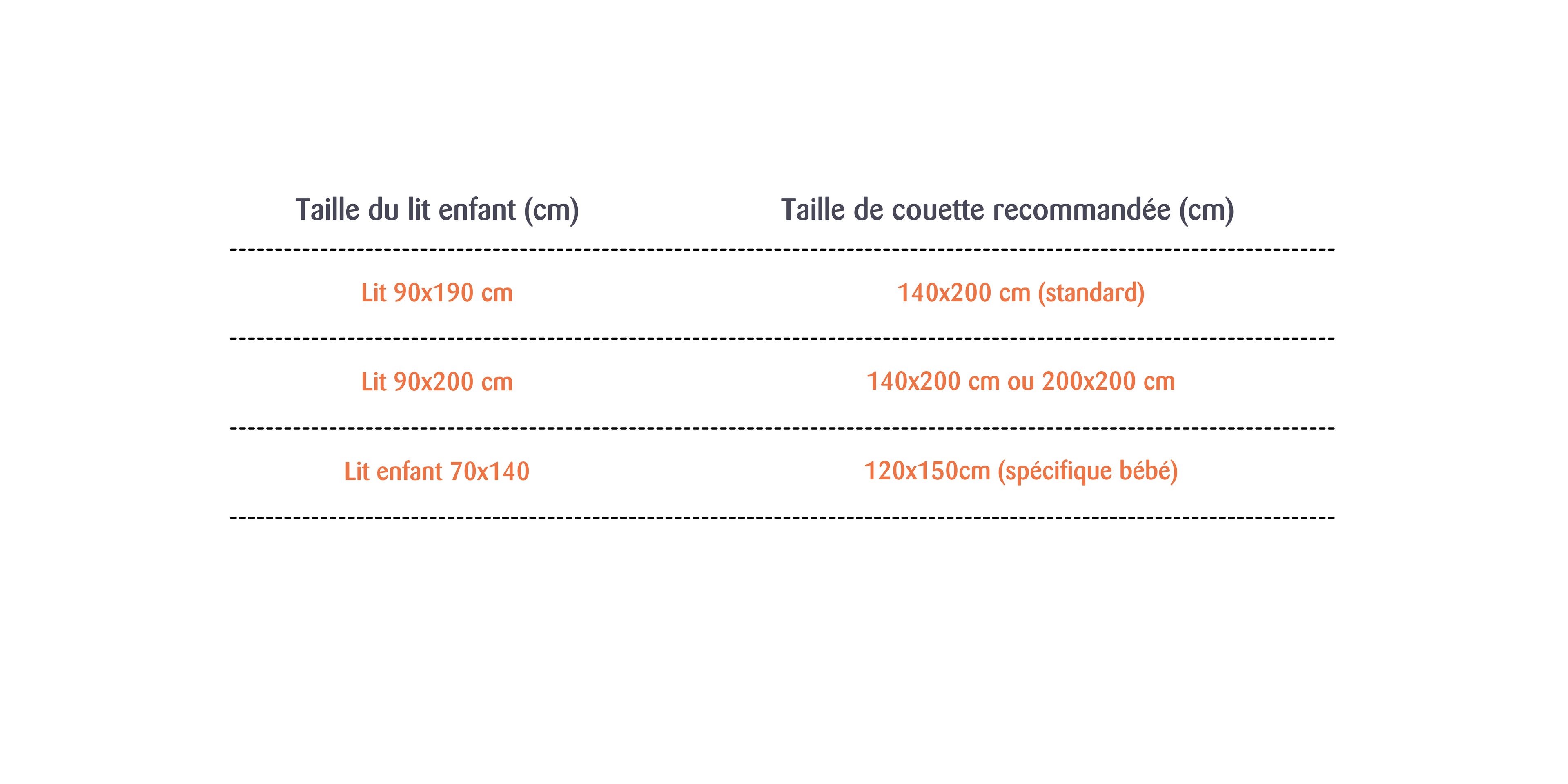 La taille de couette 140x200cm pour lit 90x190cm convient dès que l’enfant quitte son lit à barreaux, à partir de 3 ans. Elle peut être utilisée pendant toute l’enfance, l’adolescence, et même à l’âge adulte.