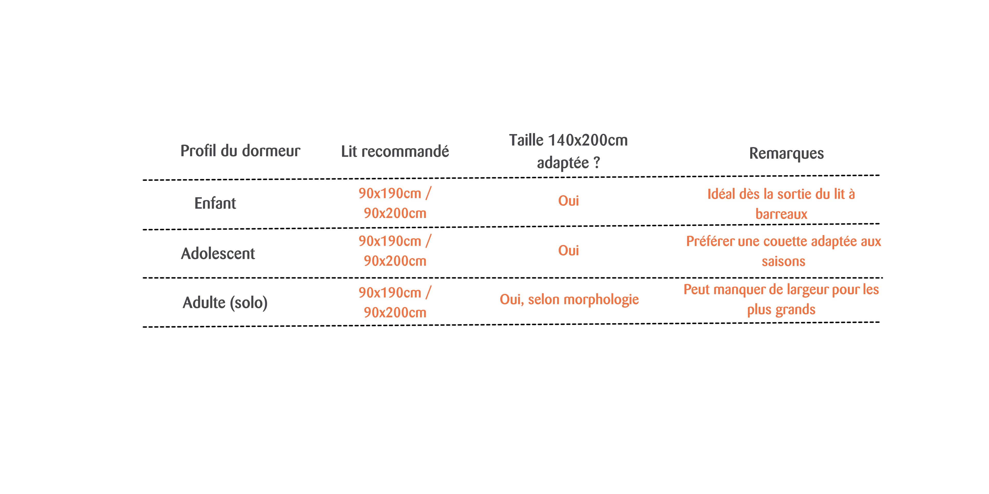 À l’adolescence, les besoins évoluent, notamment en matière de confort thermique. Certains ados sont frileux, d’autres transpirent beaucoup la nuit. La couette 140x200 cm reste une très bonne option tant que le lit est de taille standard (90x190 cm ou 90x200 cm).